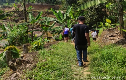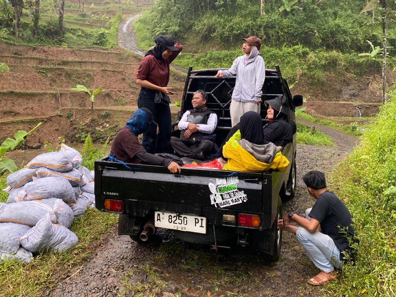 Kami segera naik dan memilih posisi duduk masing-masing diantara barang-barang. Kami sengaja memilih mobil pickup untuk meneruskan perjalanan karena medan yang sempit dan terjal. Mobil ini milik warga setempat sehingga mereka sudah mengenal medan dan ahli dalam menaklukan jalan yang terjal. Mobil melaju ke arah barat, menuju arah SMPN 1 Muncang. Jalanan berupa aspal halus dan sudah mulai sempit. Sesampainya di depan SMP kami berbelok ke kiri, masuk ke jalan yang lebih sempit dan rusak dengan sisa-sisa aspal yang ada sampai di sekitar pemukiman.