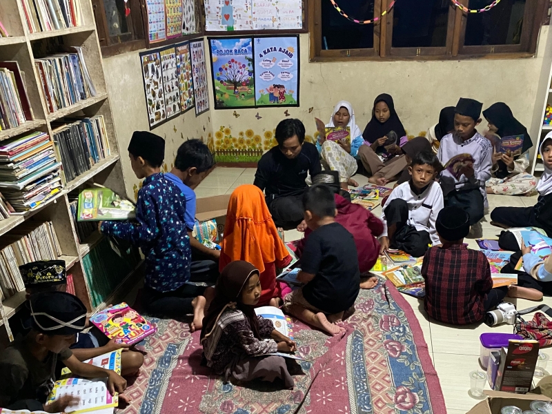 Suasana taman baca saat anak-anak Ciseel sedang asyik membaca buku baru.